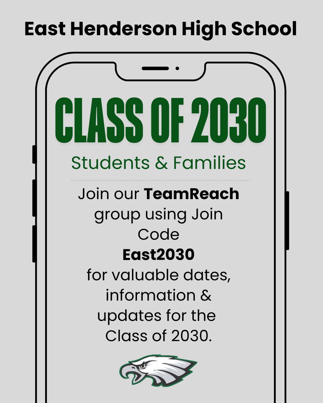 As we get ready to finish up the 2025-2026 school year and prepare for the transition to high school, East Henderson would like to share important communication with parents and students to help make the transition as smooth as possible. One way they do that is by having an easy line of communication directly to students and parents through the TeamReach app. The Class of 2030 and their families are invited to join our TeamReach group using the following Join Code: East2030
